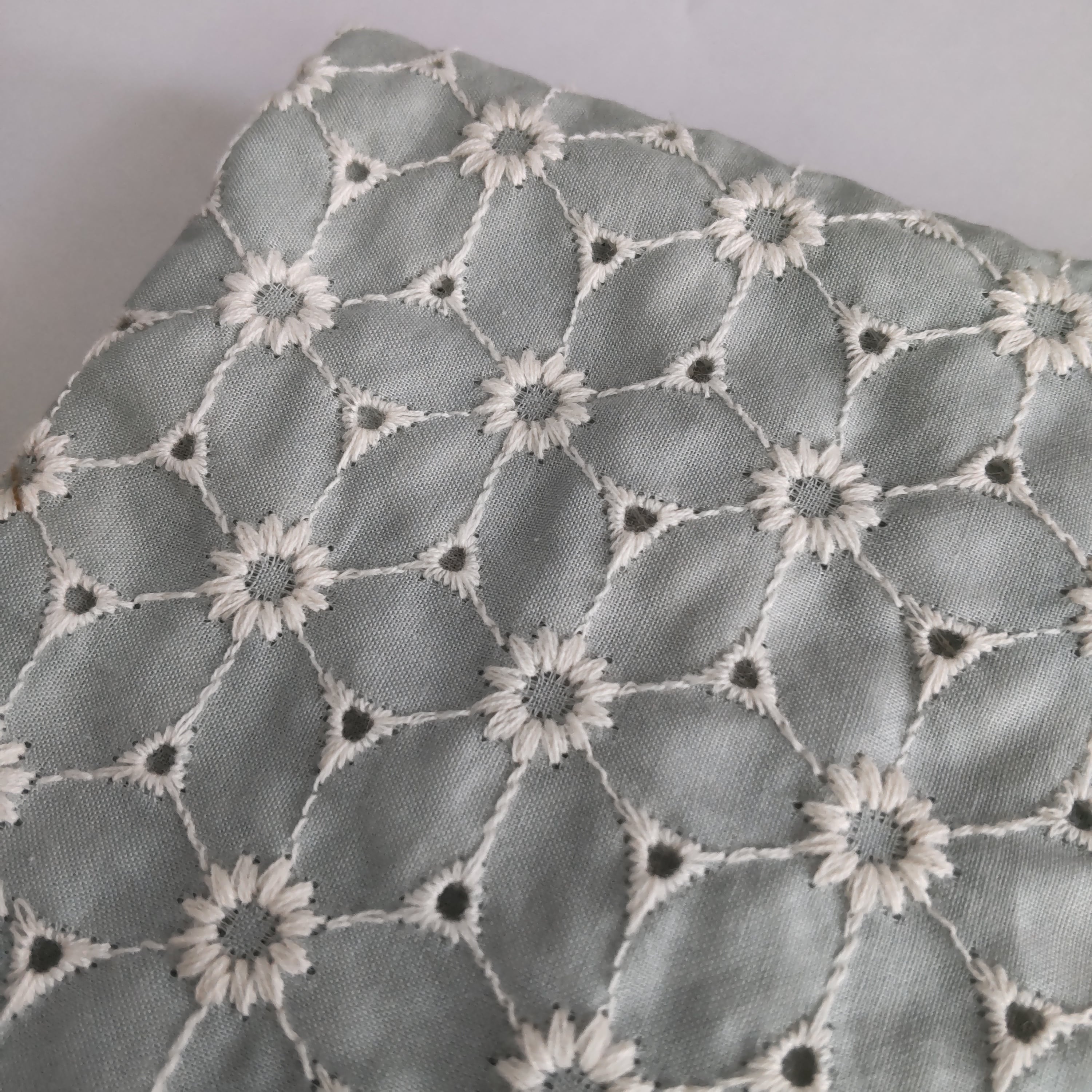小さなアイレットと、お花模様の刺繍がびっしりと広がる、愛らしい表情の刺繍レース生地です。繊細な刺繍が重なり合い、見た目にも華やかで可憐な印象に仕上がっています。