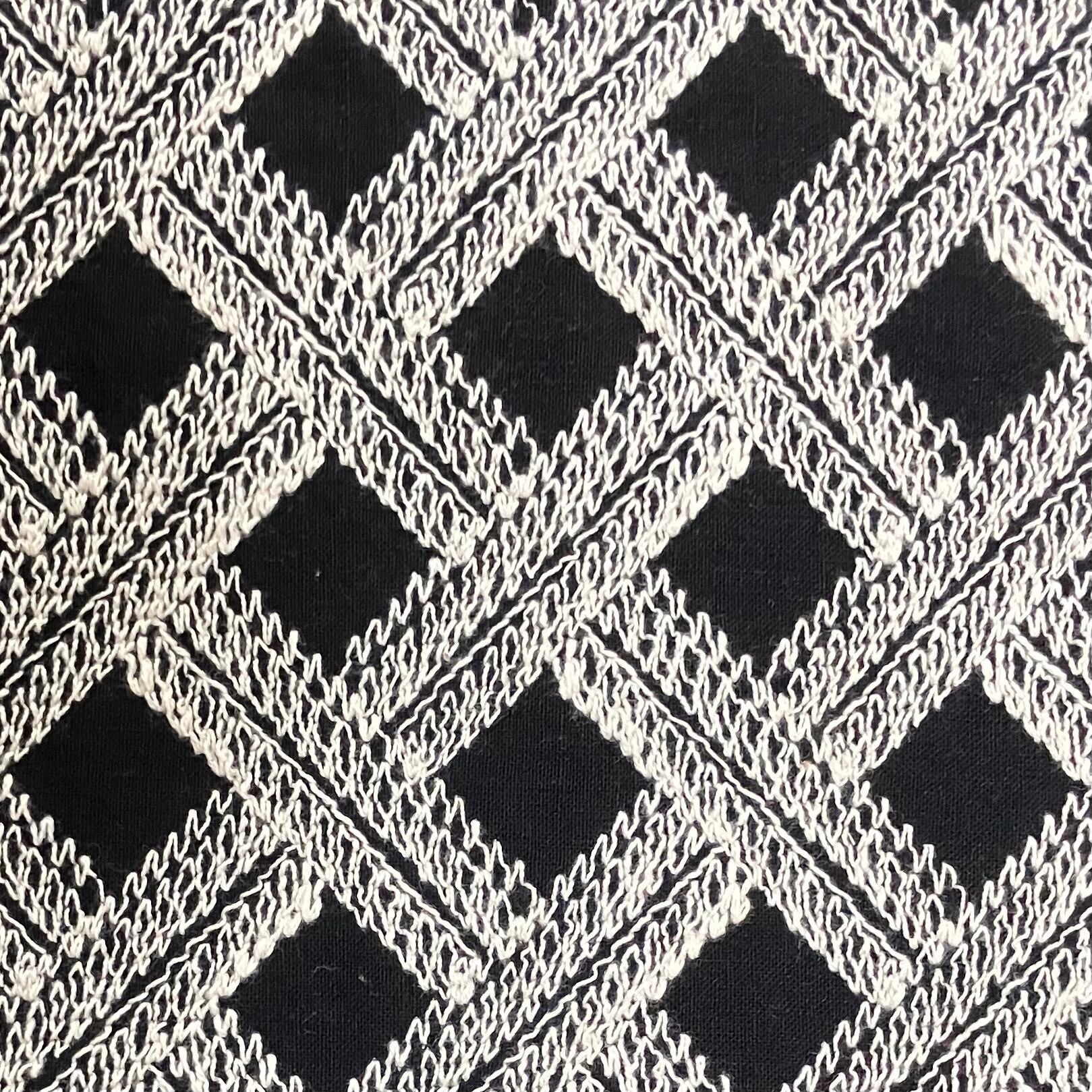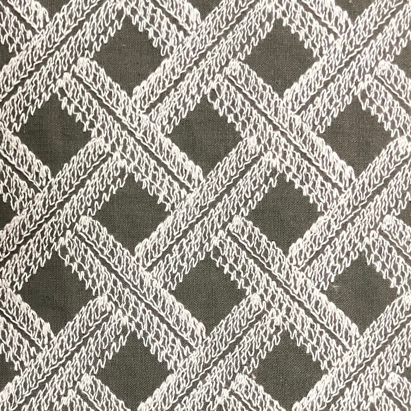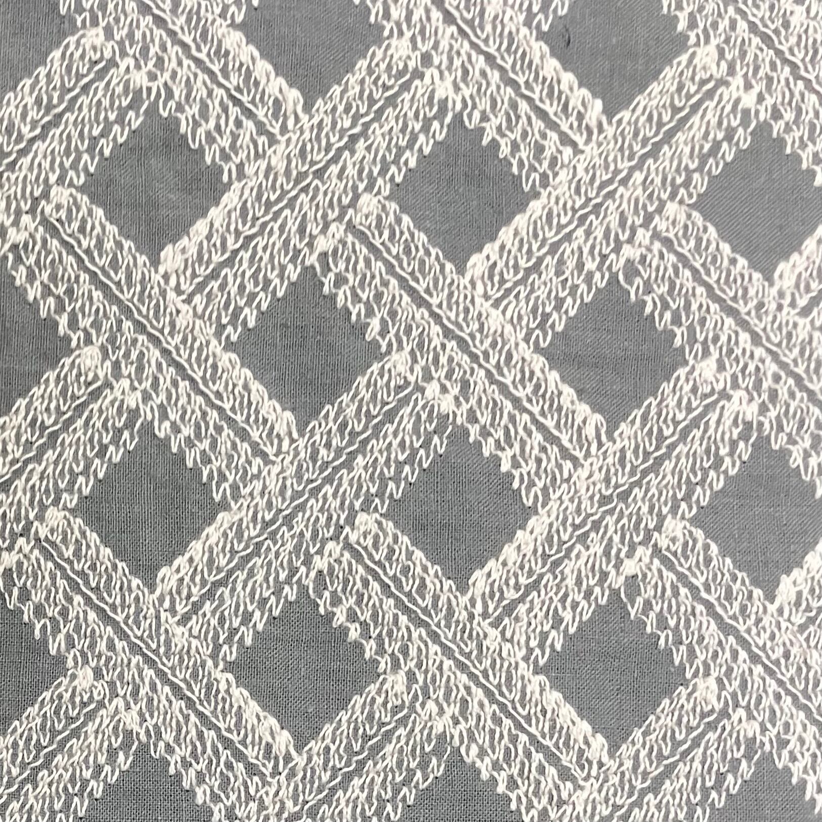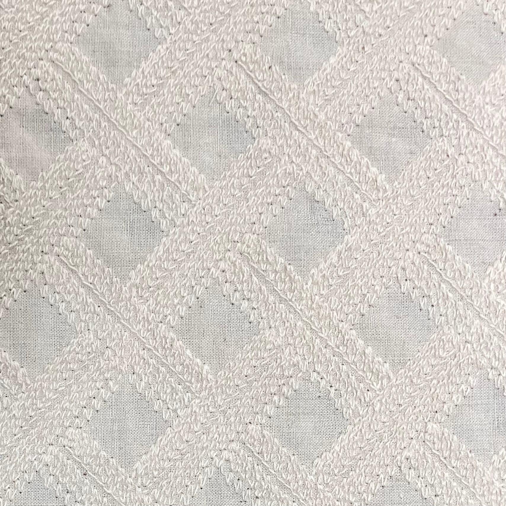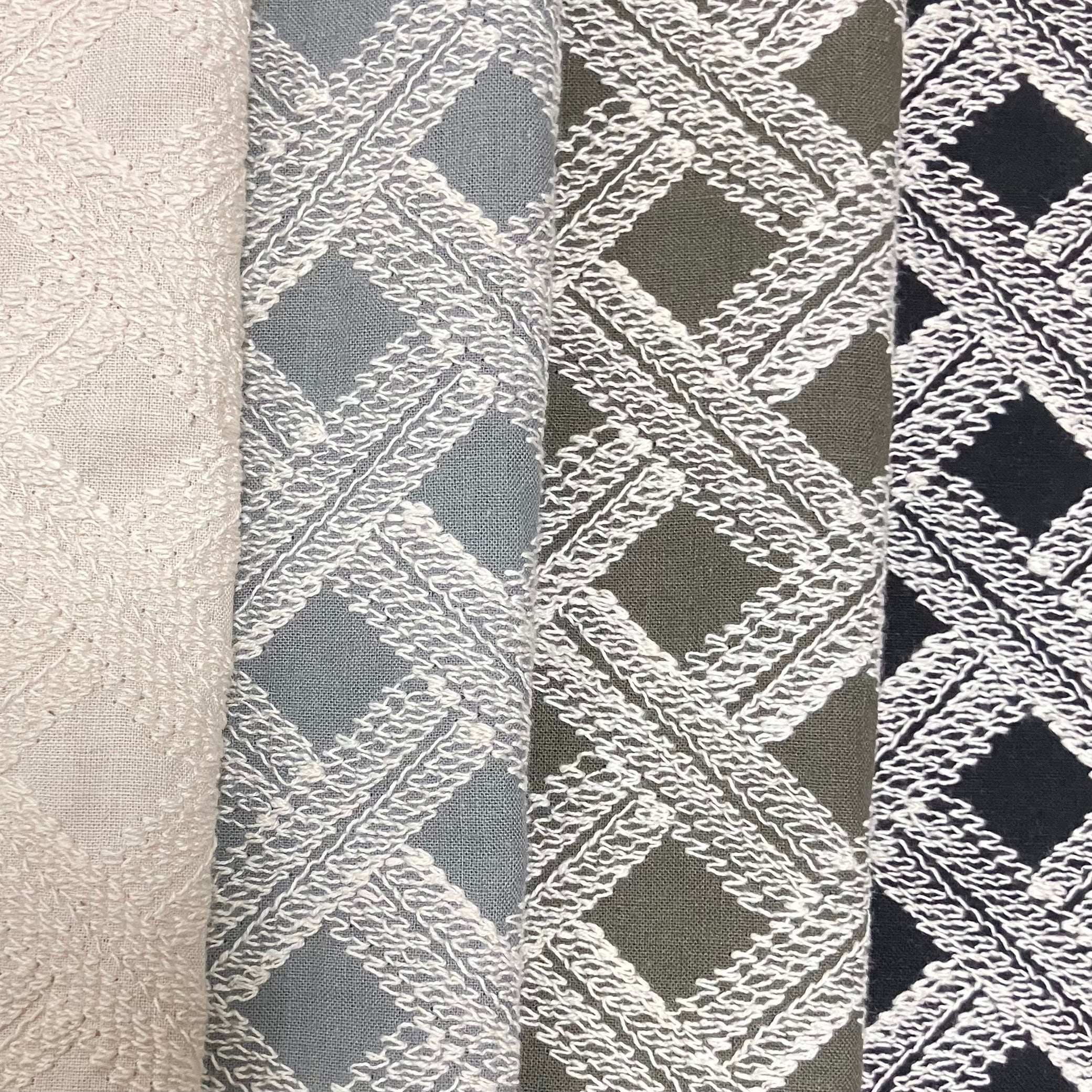 斜めに流れるバイアス状の刺繍ラインが、生地に動きと立体感を与え、シンプルながら存在感のある表情に仕上がっています。直線とは異なる柔らかなラインが、ナチュラルで洗練された印象を演出します。