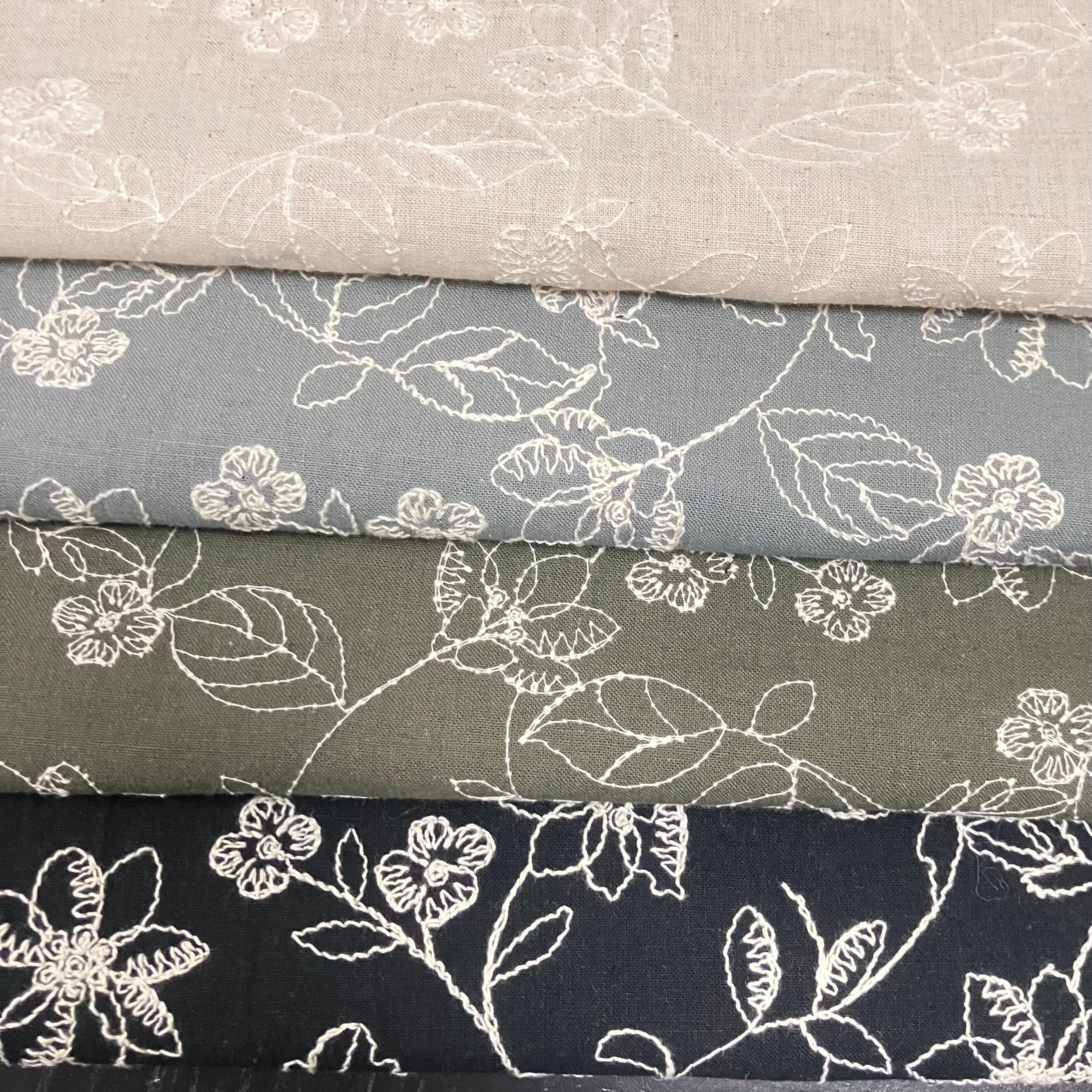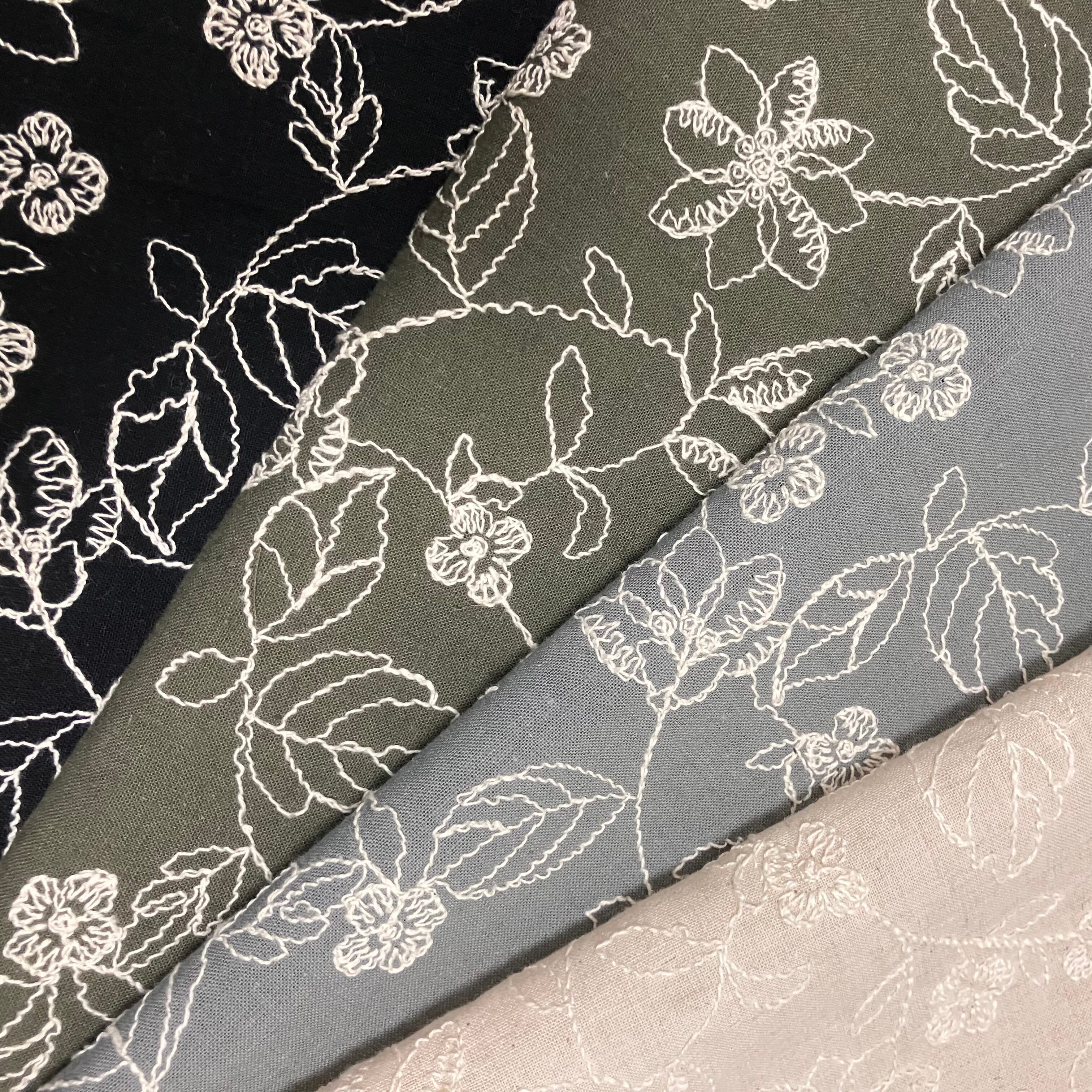 刺繍による繊細な凹凸が生地に立体感と奥行きを与え、プリントにはない高級感のある仕上がりになっています。