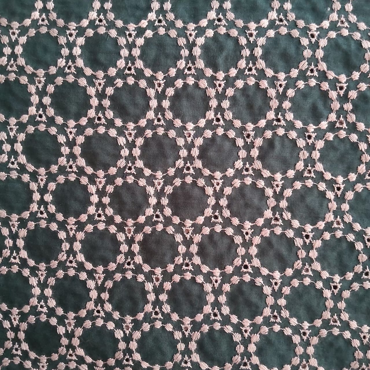 やわらかなコットンローン生地に、ドットサークル柄の刺繍を施した刺繍レース生地です。
