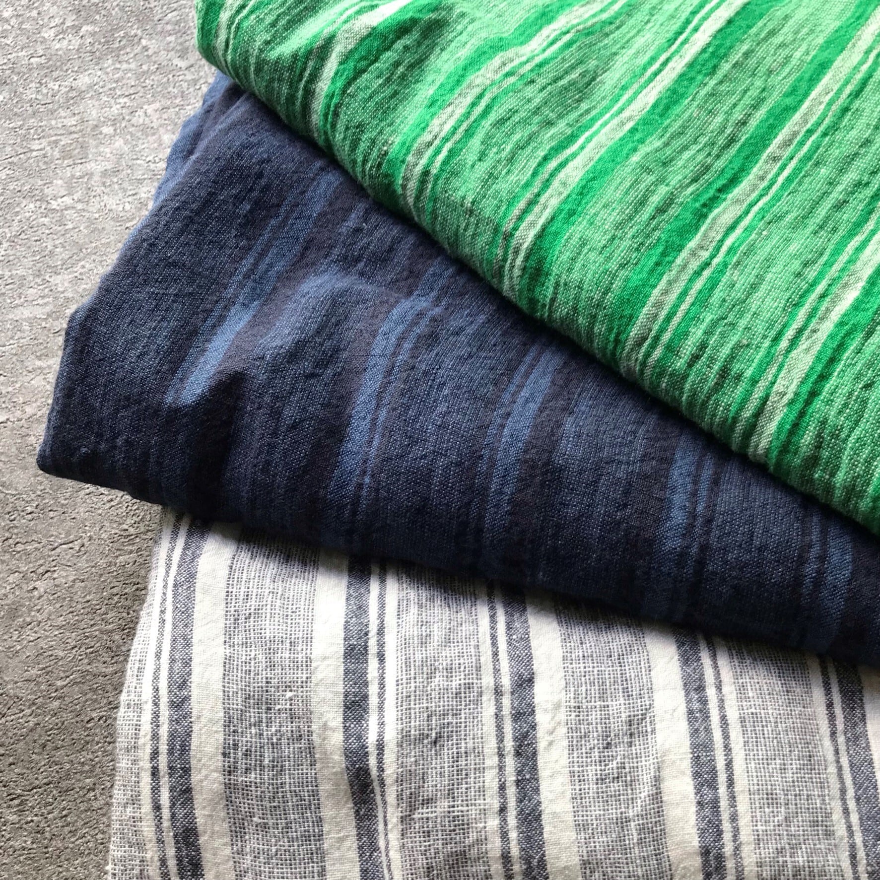 ランダムに入った刷毛目(ハケメ)と、ストライプ柄を強調した中肉40番手リネン生地です。